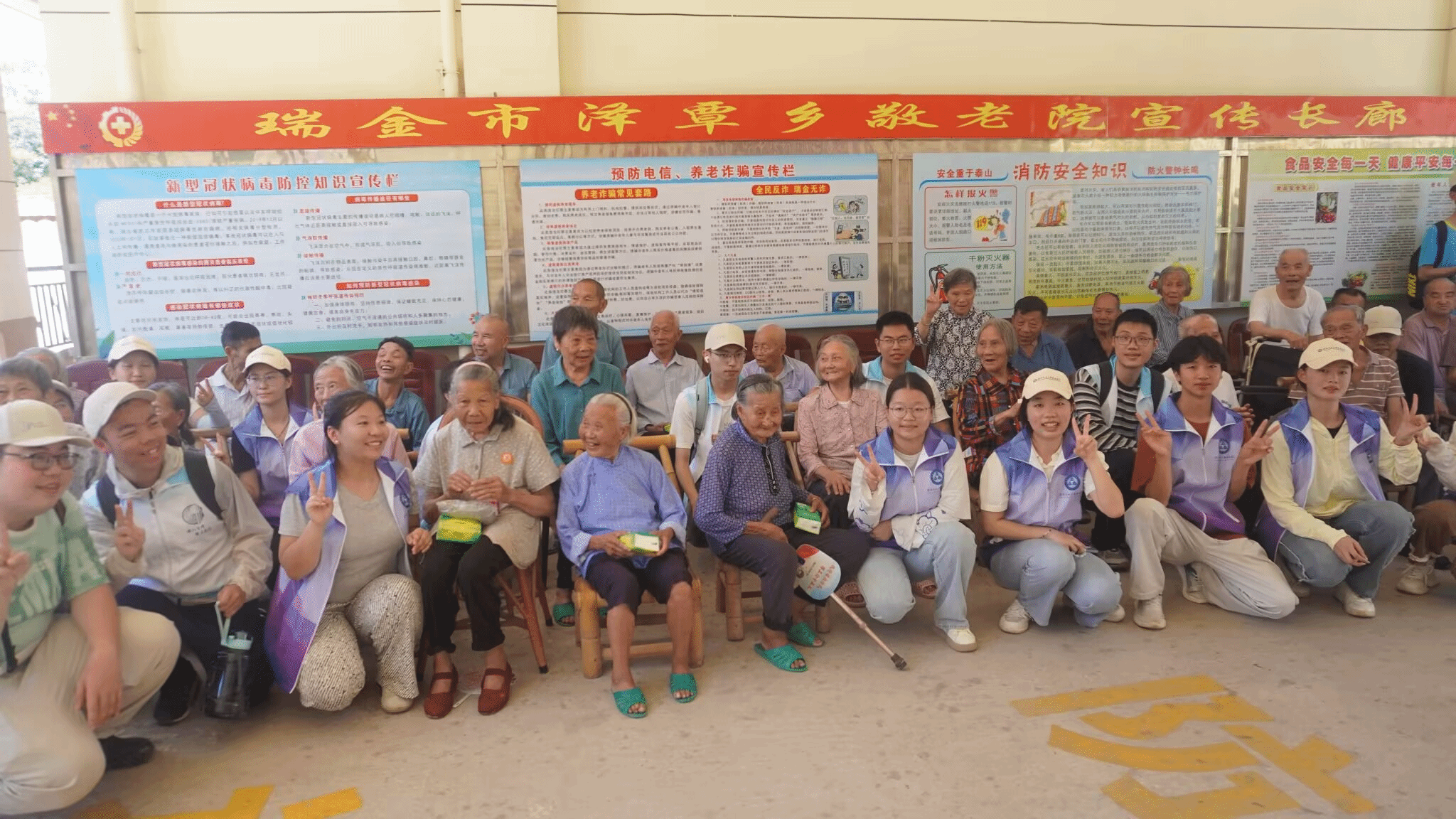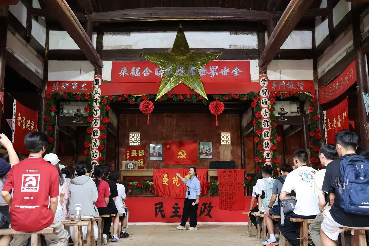 7月23日至25日,实践队深入瑞金市沙洲坝、叶坪等革命旧址,探寻苏区精神深刻内涵。在沙洲坝红井畔,队员们从“吃水不忘挖井人”的历史烙印中体悟为民初心;在华屋红军烈士纪念亭前,队员们聆听“十七棵松”的感人故事,深刻体会革命先烈的无私奉献精神;在中华苏维埃临时中央政府大礼堂与中国革命根据地纪念馆,一处处斑驳墙面、一件件陈列文物、一幅幅历史图片,仿佛让队员们重返那段波澜壮阔的峥嵘岁月;在泽覃光荣敬老院,队员们向老人开展防诈骗宣传、太极拳教学,帮助老人整理居室,并创作《不要领鸡蛋》情景剧。86岁的老红军后代张奶奶看完情景剧拉着队员们的手说:“你们有文化、有热情,表演得真好!”