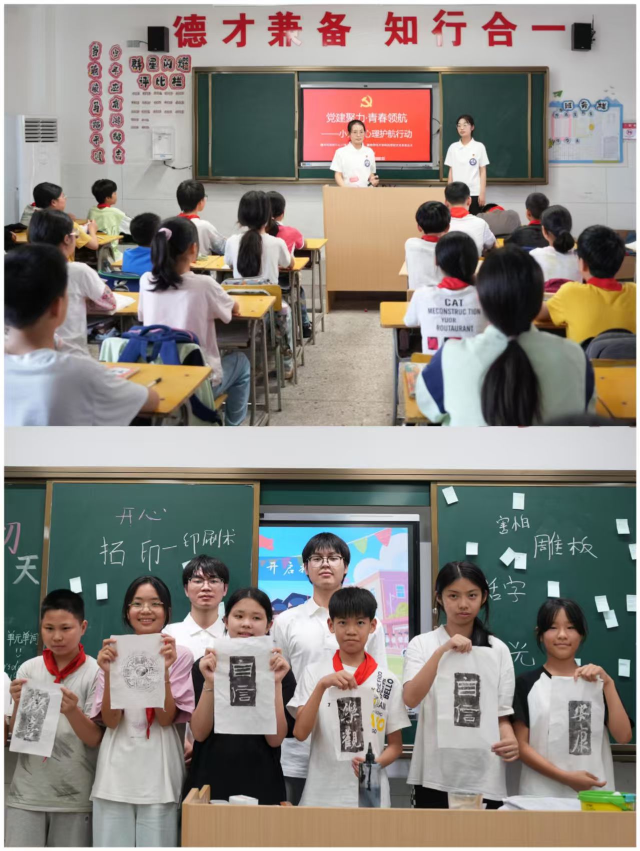 实践队聚焦六年级学生面临小升初学习压力、青春期困惑等,通过互动游戏、情景模拟、小组讨论等方式,引导孩子们正确认识学业压力、生理变化和人际交往等可能面临的心理变化,深入浅出地讲解心理健康知识,帮助他们以积极乐观的心态面对学习,用科学健康的态度去接纳崭新的自己。期间,实践队还精心策划了“漆扇”和“传拓技艺”非遗项目体验活动。孩子们在志愿者的指导下,将小学美好记忆和对未来的憧憬绘制于扇面,将文字、纹饰从拓片上拓印下来,在实践中深刻感受中华传统文化的博大精深。