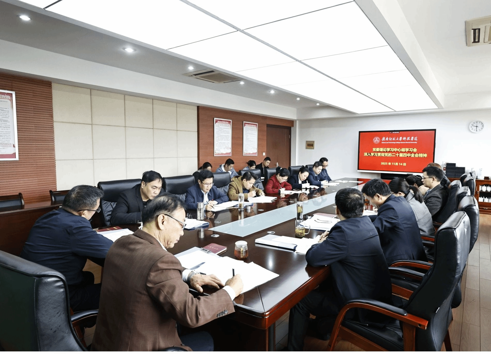 11月14日,学院在综合楼417会议室召开党委理论学习中心组(扩大)学习会议,深入学习贯彻党的二十届四中全会精神,党委书记张小东主持并讲话,学院党委理论学习中心组成员参加,二级党组织负责同志列席会议。